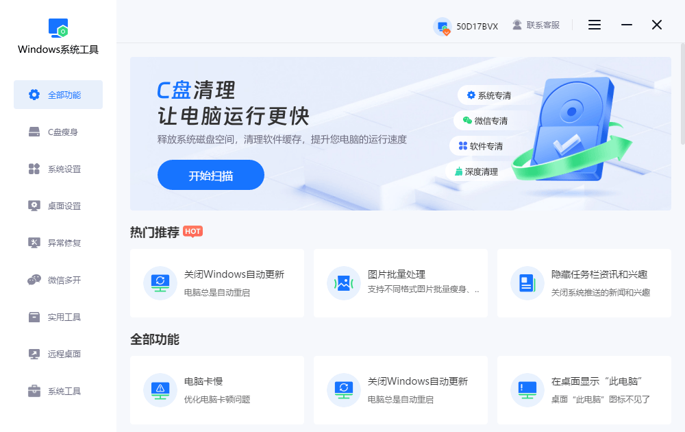 参考推荐用“Windows系统工具”,Windows系统工具是一款集C盘垃圾清理、系统优化设置、异常问题修复、图片批量处理、日常办公学习…等多功能综合性Windows实用工具软件。