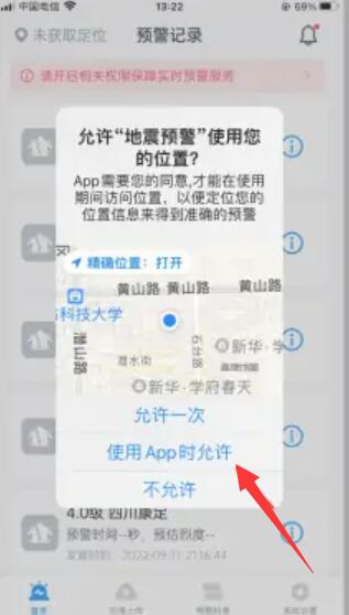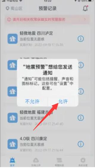 9、在跳转的小窗口的中点击【允许】选项,之后就可以在苹果手机中成功设置地震预警了。