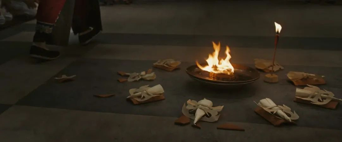 再接着,喃呒师傅挥舞桃木剑,象征驱逐邪灵,然后用剑击碎瓦片,打破地狱之门。