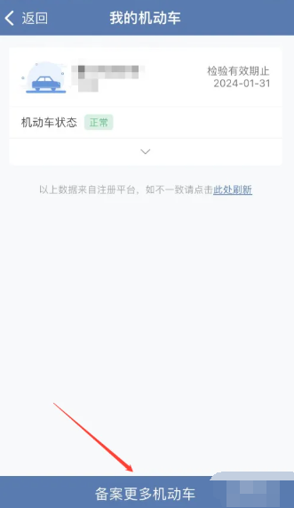 2、之后在我的机动车页面,点击最底部的【备案更多机动车】;