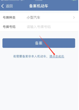 3、接着在备案机动车的功能页,点击下图箭头所示的【请点击此处】;