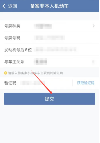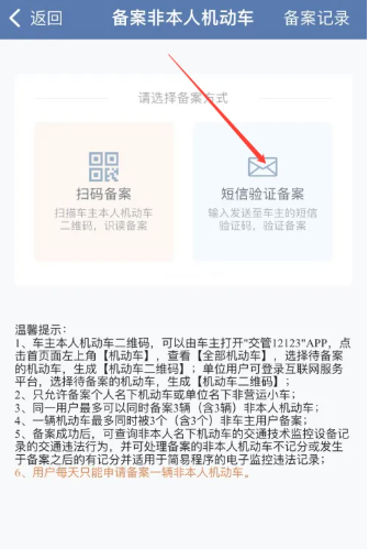 4、然后跳转到备案非本人机动车页面,选择【短信验证备案】;