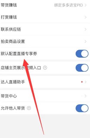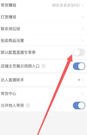 4、找到默认配置直播专享券开关。