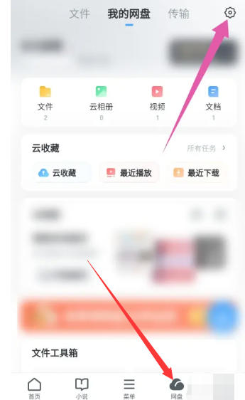 1、首先打开uc浏览器APP进入到网盘专区,专区点击右上角【设置】功能;