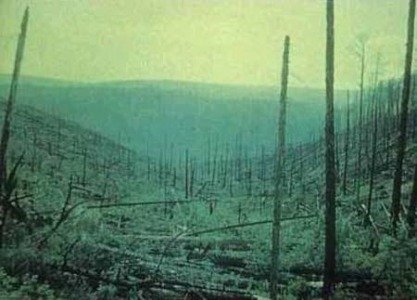 爆炸后,中心区域树木呈放射状倒伏,部分树木仅被烧焦枝叶而未倒,年轮生长异常加速。