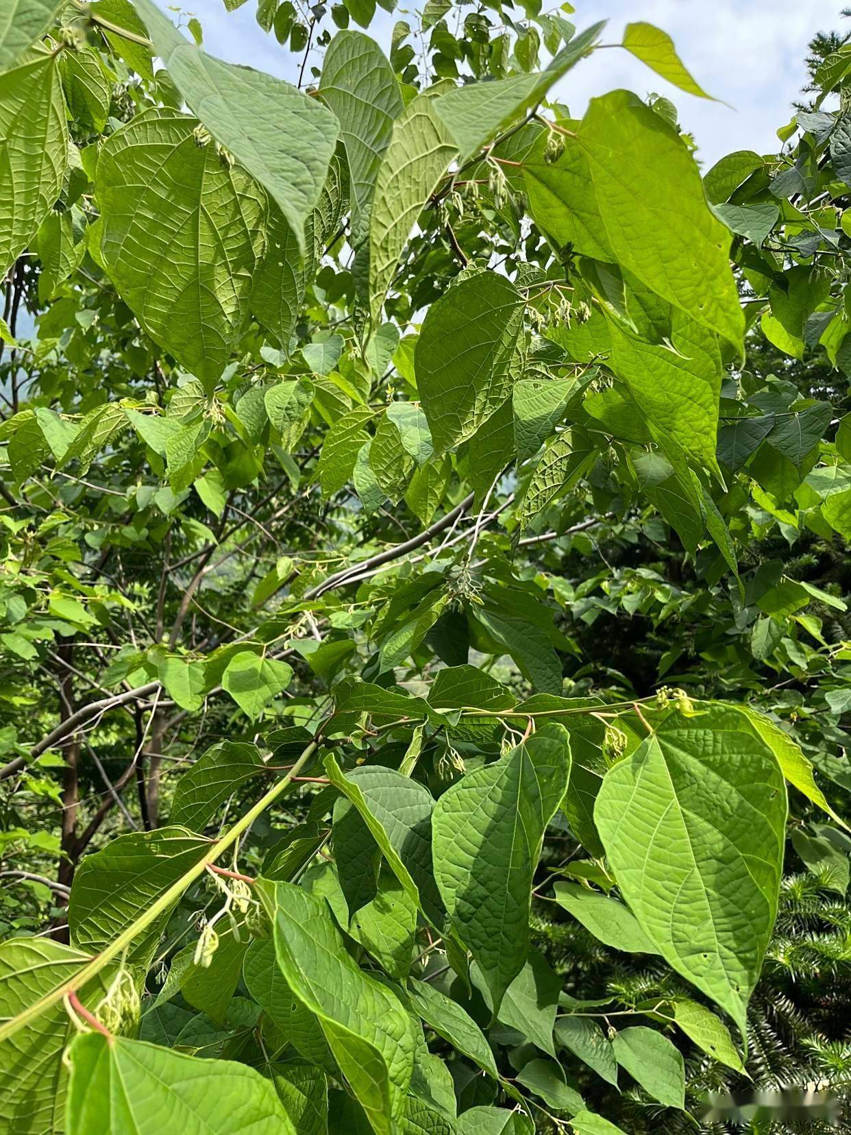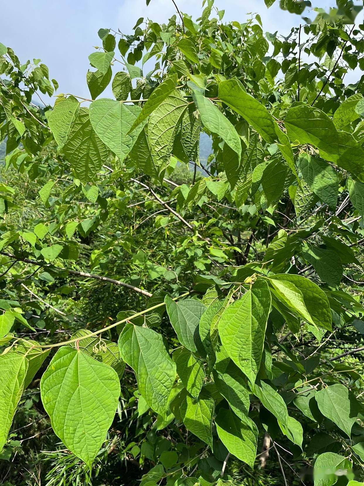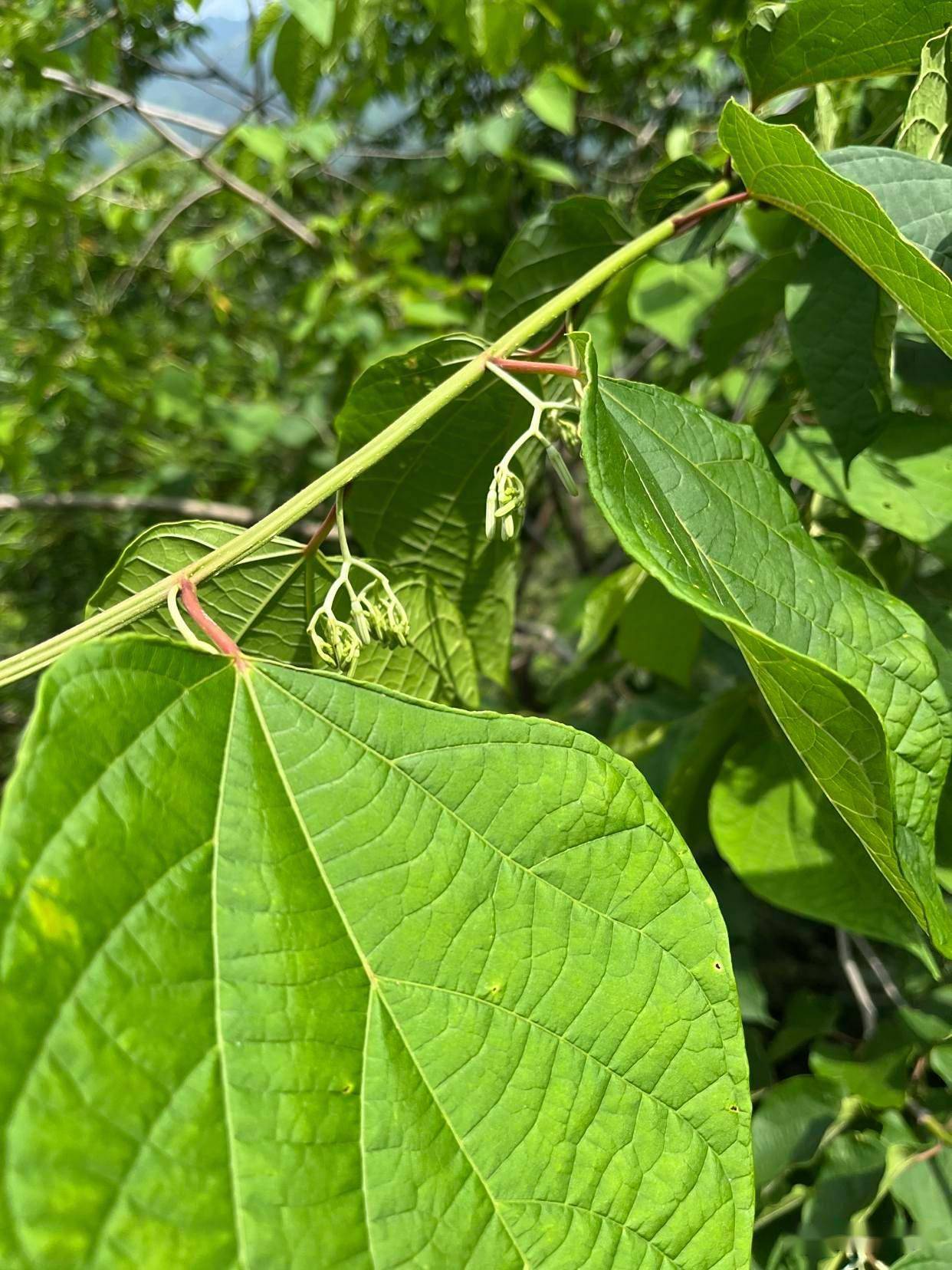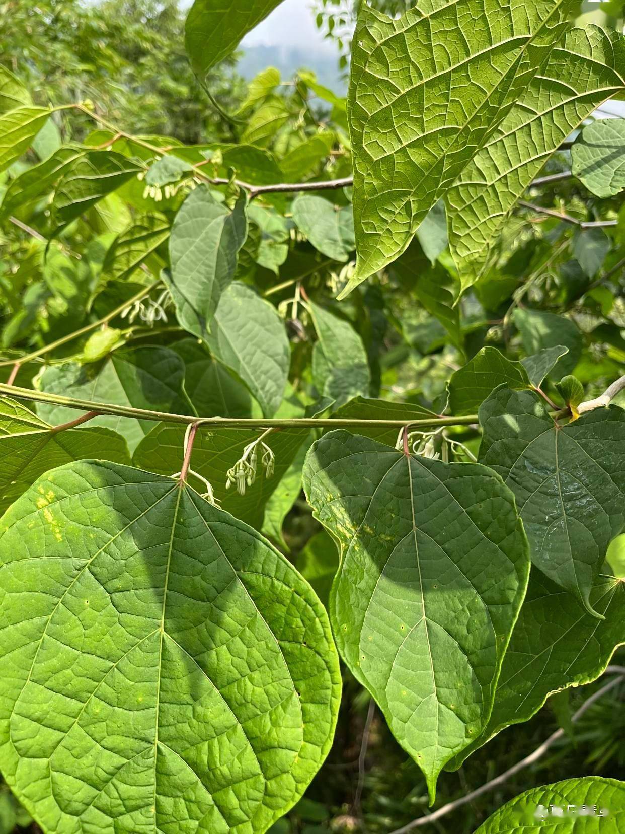 2. 叶:单叶互生,叶片形状变异较大,多为卵形或心形,长10-20厘米,基部常不对称,全缘或3-7浅裂(裂片形似“八角”,故名)。