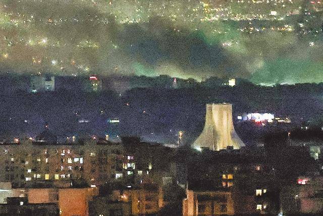 在德黑兰西部的阿扎迪广场附近,伊朗遭遇了空袭,浓烟升起。