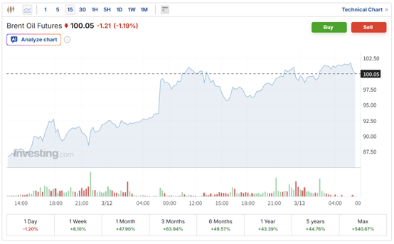 (布伦特原油期货15分钟走势图 来源:英为财情)国际油价周四大幅上涨,因霍尔木兹及其附近水域船只持续遭到袭击,且伊朗最高领袖穆杰塔巴·哈梅内伊3月12日在其就任以来的首份声明中誓言将继续封锁霍尔木兹海峡。