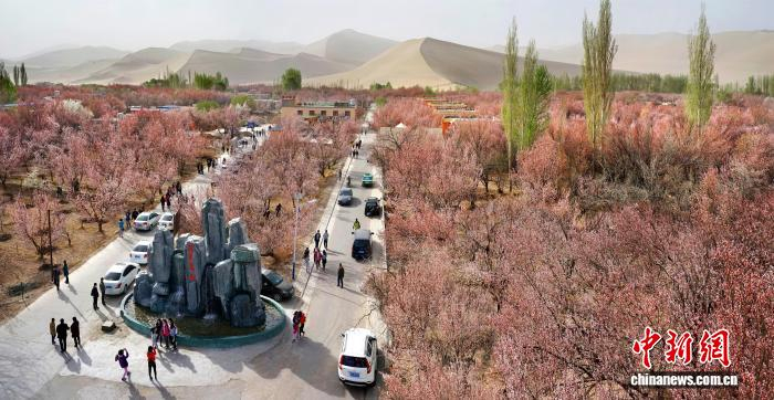 每年4月,鸣沙山下月牙泉村,杏花次第开放。图为月牙泉村航拍。