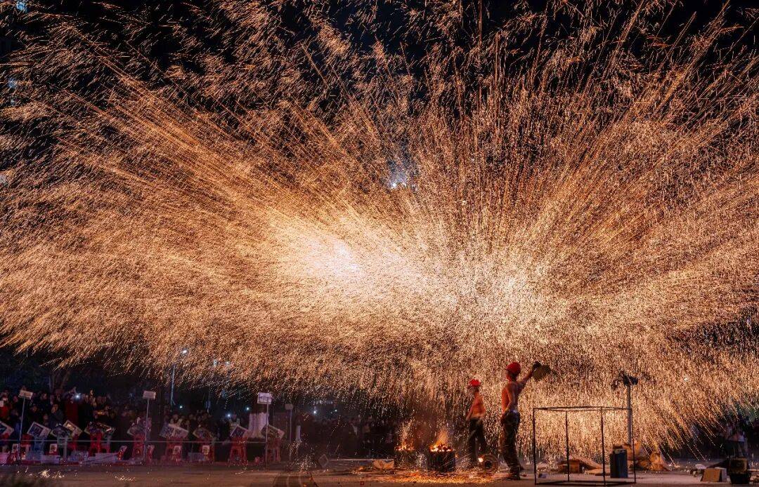 2月19日,在四川省巴中市体育馆广场,演员为市民表演打铁花。