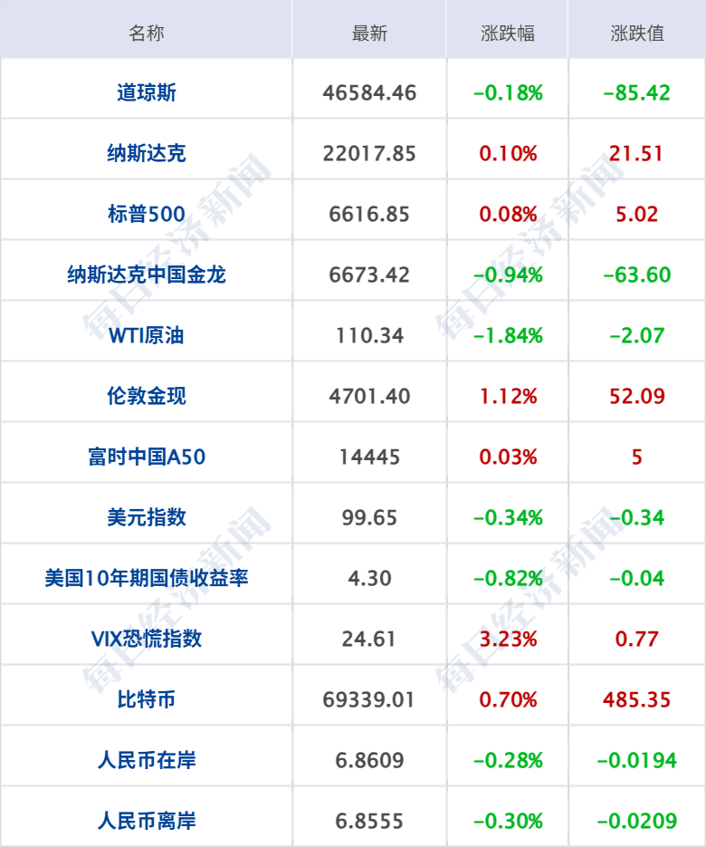 美股三大指数收盘涨跌不一,纳指涨0.1%,标普500指数涨0.08%,道指跌0.18%,其中,纳指和标普500指数录得四连涨;