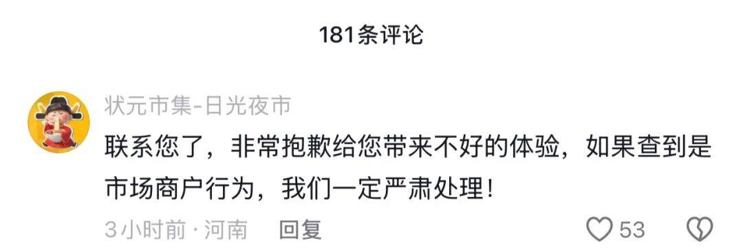 大皖新闻记者注意到,状元市集蓝V认证的商家账号也在评论区留言致歉,表示“非常抱歉给您带来了不好的体验”,并承诺“如果查到是市场商户行为,我们一定严肃处理!”记者随后尝试联系发帖游客,但截至发稿尚未获得回复。