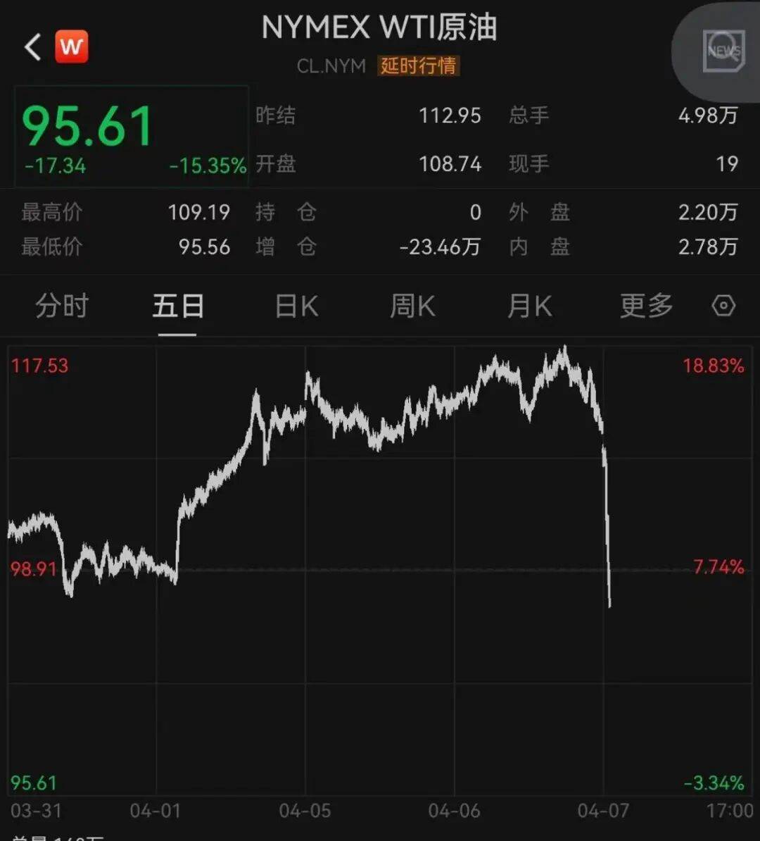 截至发稿,NYMEX WTI原油价格跌超15%。