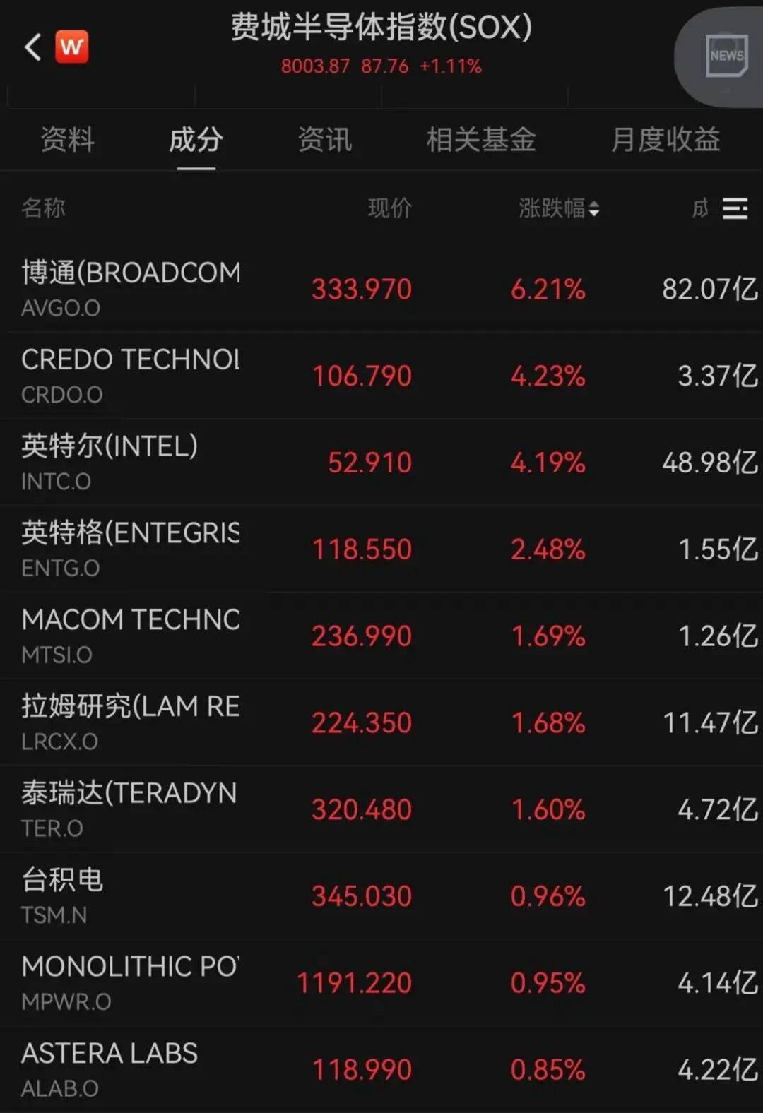 博通涨超6%,英特尔涨超4%。